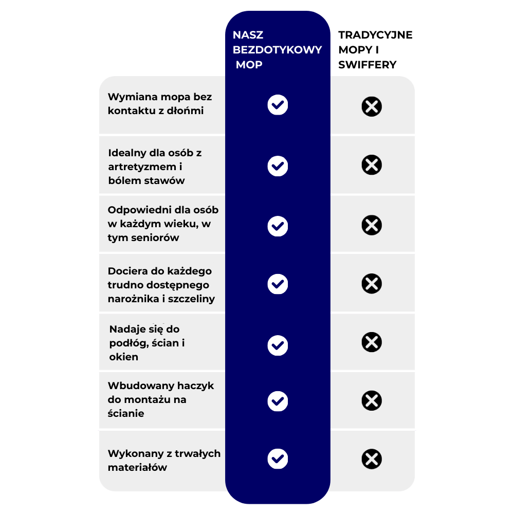 Przejmij kontrolę nad sprzątaniem już dziś. Dlaczego wciąż używać brudnych, pełnych bakterii głowic mopów lub wydawać pieniądze na drogie wkłady? Dzięki poręcznemu mini mopowi z wymienną ściereczką sprzątasz dom czyściej, łatwiej i taniej.
