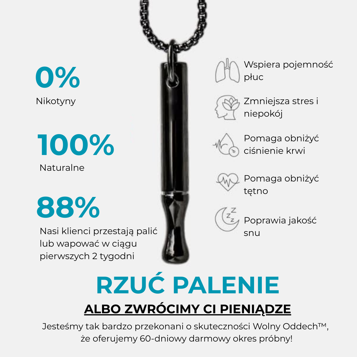 Nie. Wolny Oddech™ jest w 100% naturalny i nie zawiera nikotyny, leków ani chemii. Używasz wyłącznie oddechu — bez skutków ubocznych i bez uzależnienia.